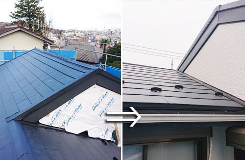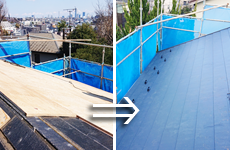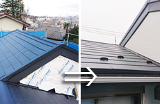 外壁、屋根、フェンスをリフォームしました。屋根の葺き替えを行う場合、屋根だけではなくその下にある防水シートも交換するため、屋根材が長く保たれます。また、軽く優れた屋根材は、地震発生時の倒壊のリスクも減少します。 |
